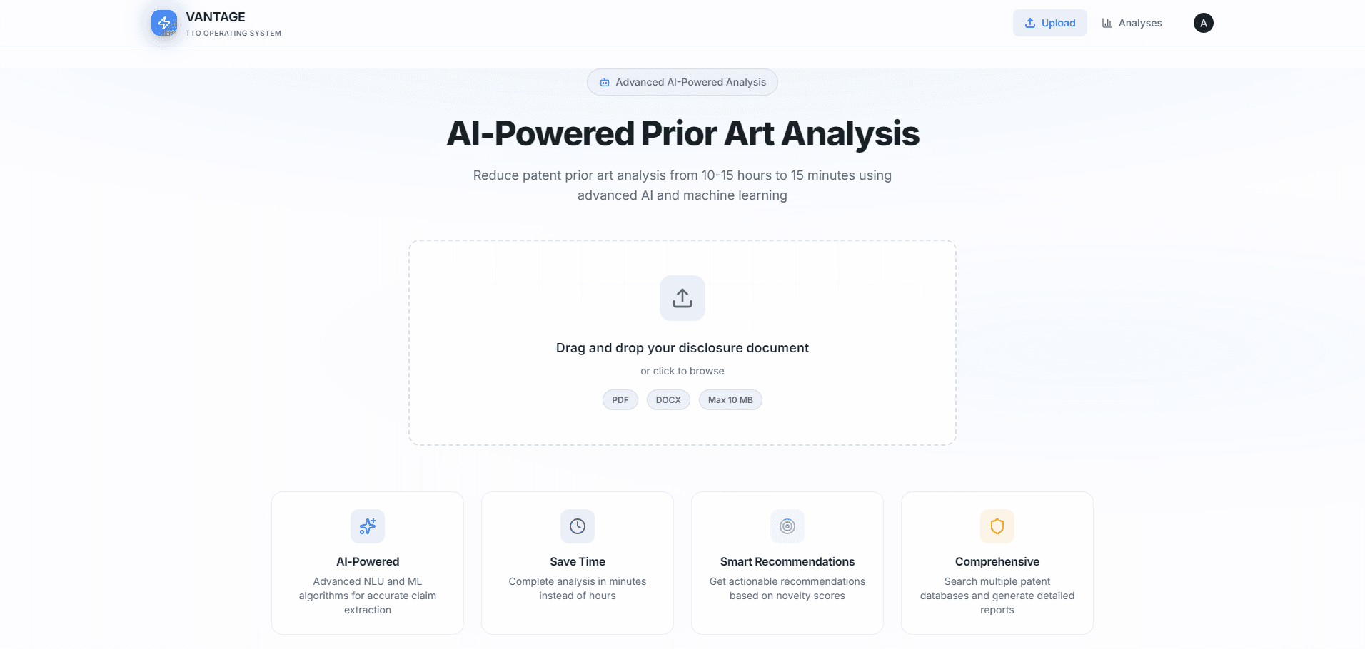 A production-ready microservices platform helping Technology Transfer Offices (TTOs) accelerate invention disclosure. It orchestrates distributed AI workers to analyze novelty against 100M+ patents, reducing analysis time from 15 hours to minutes.